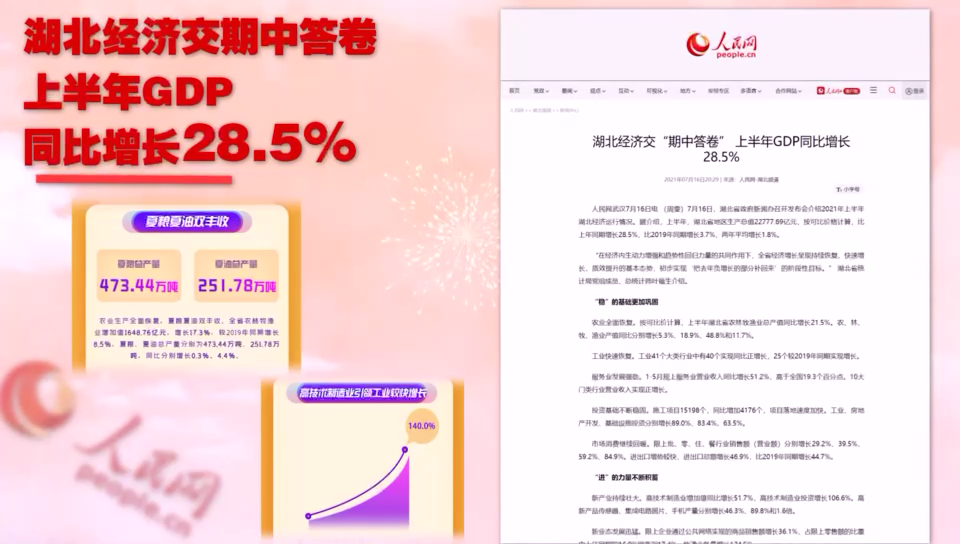 人民网报道:湖北经济交“期中答卷” 上半年GDP同比增长28.5%