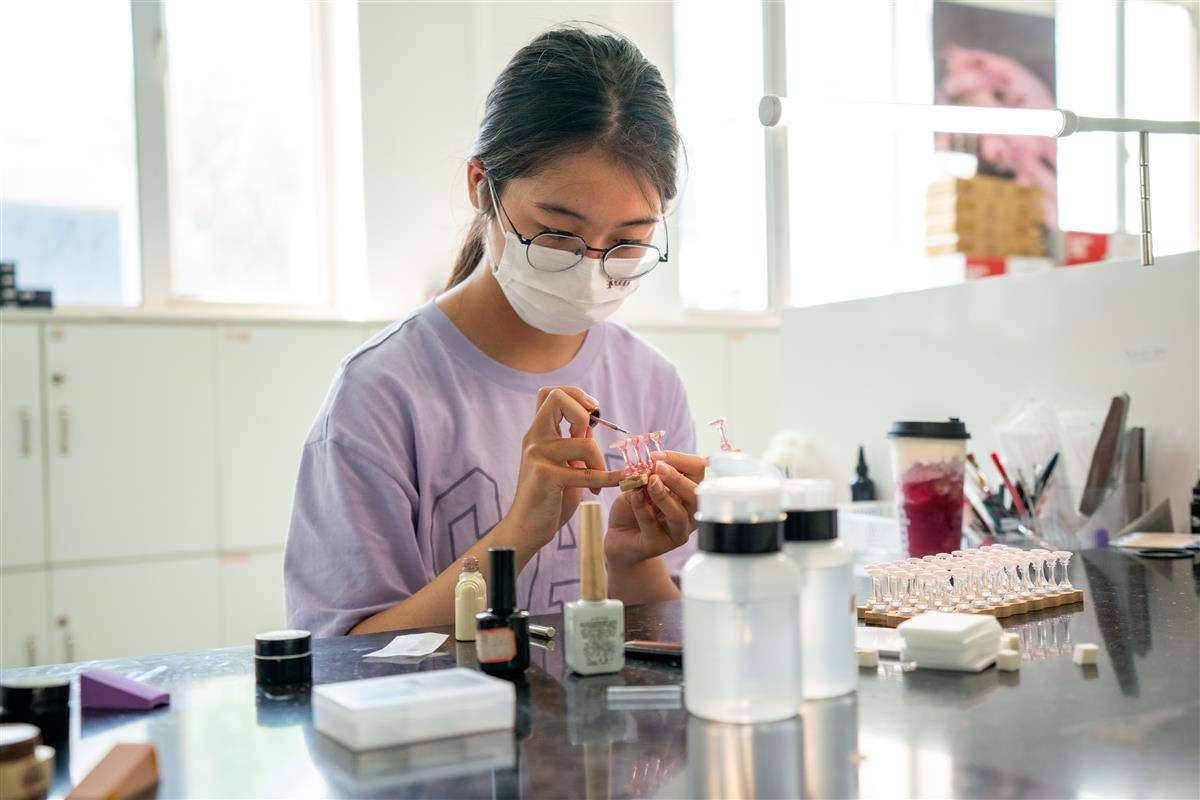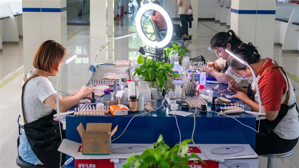 张艳平今年37岁,曾是一名美甲店店主,生意好时忙到晚上九十点钟,没法照顾好2个孩子。经营一年半后,她放弃了自己喜爱的事业。加入美丽工坊后,如今,张艳平每天能制作20余副穿戴甲,“工作时间灵活,工资一单一结,有些工序还可以带回家做,非常适合我这样的宝妈群体。”
