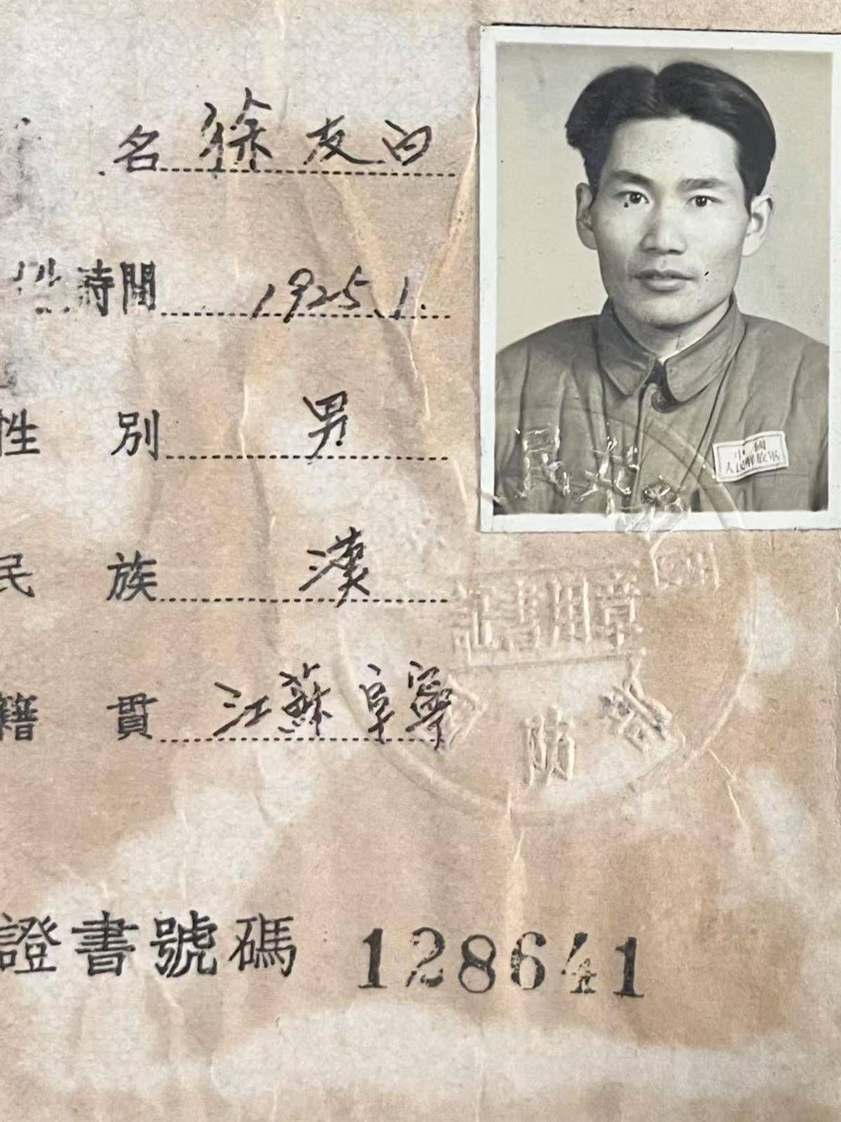 徐老年轻时的登记照。