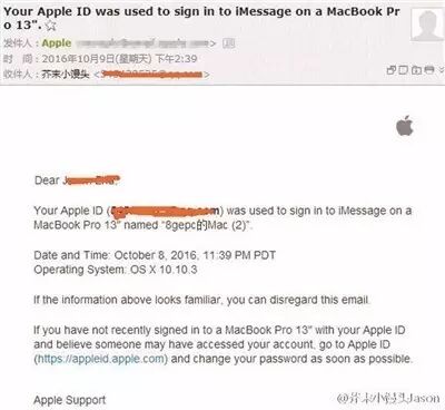 △苹果手机用户收到的账号异常登录邮件