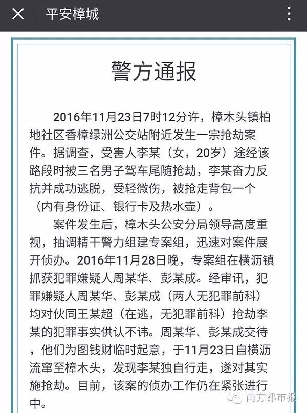 12月2日,东莞樟木头警方发布通报称,这起抢劫案两名犯罪嫌疑人被抓获,一人仍在逃。受害女子受轻微伤,被抢走背包一个,内有身份证、银行卡及热水壶。