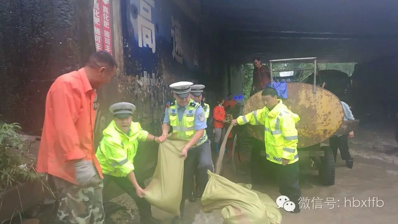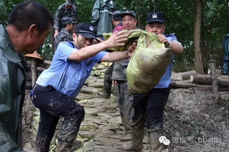 7月6日,彭场镇北干渠芦林湖堤段出现险情,彭场派出所15名抢险突击队员赶赴现场,他们和群众一道扛沙包、打桩,汗水和雨水裹满了衣裤,奋战5小时不下战场……