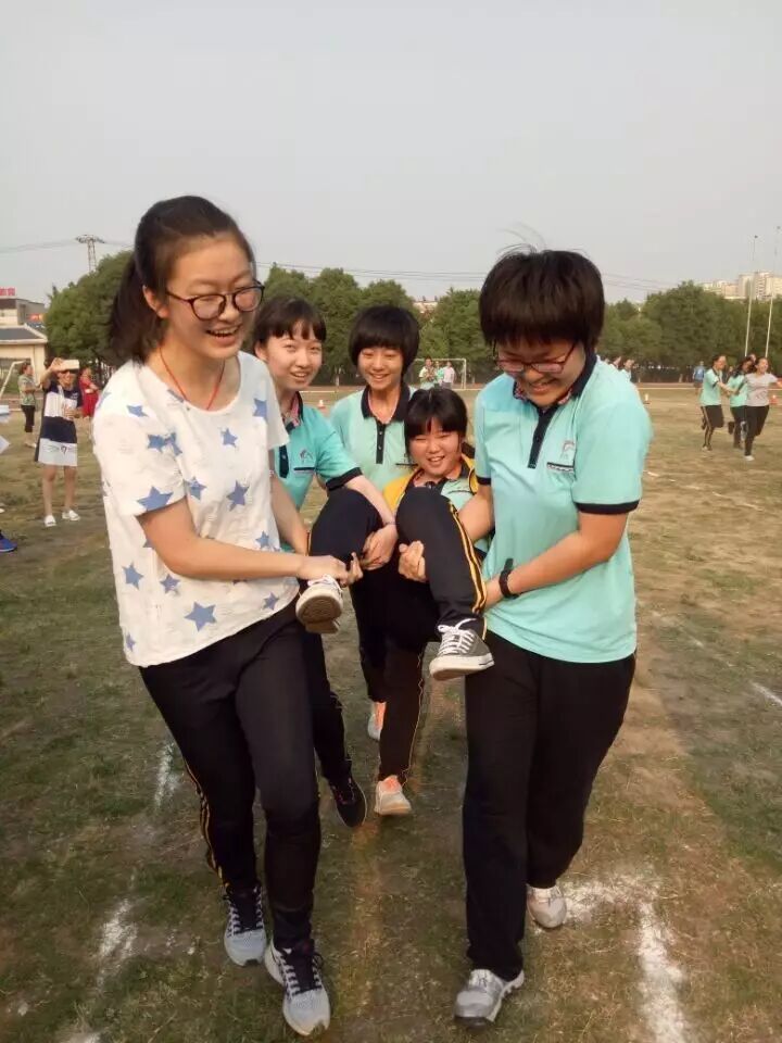 高考前减压趣味运动会上范筱雨(右前穿绿衣者)的照片