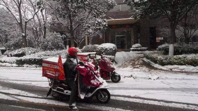 尽管大雪,不少外卖、快递还在接单。如果你的外卖、快递迟了点,请不要谩骂,为了生活,他们比你们更着急。下雪路况不好,路面结冰湿滑,很多电动车骑手都是一边用脚支撑一边开……请理解,并对他们说一声“谢谢,注意安全!”