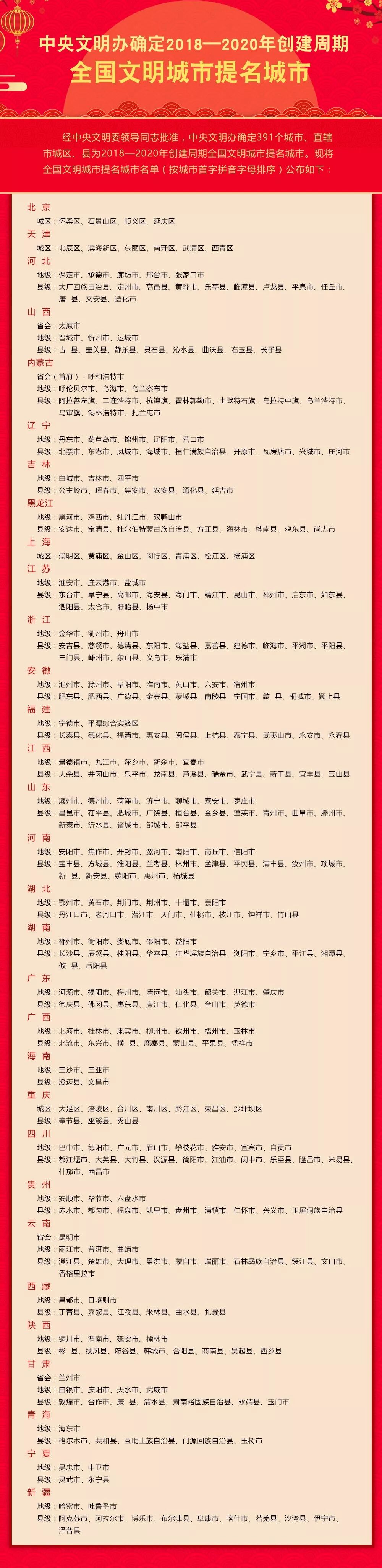 2月14日,中央文明办发布了2018—2020年创建周期全国文明城市提名城市。