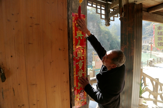 下党乡村民王光朝正在茶馆门口贴春联(王子侯 摄)