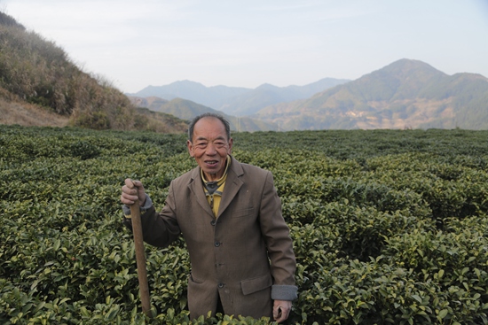 王光朝站在自家茶园里露出幸福的微笑(王子侯摄)