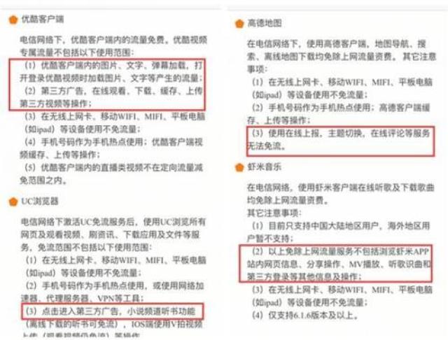 记者近来调查发现,以优酷和中国电信合作的“大小鱼卡”为例,其说明显示,“优酷视频专属流量不包括优酷客户端内图片、文字、弹幕加载、打开优酷视频时加载图片、文字等产生的流量。”播放第三方广告也单收流量费。