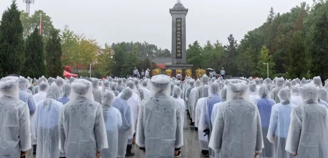 雨丝绵绵润大地,英魂昭昭映人心。胡家台抗战遗址内,松柏苍翠,庄严肃穆。巍然耸立的革命烈士纪念碑上,“胡家台抗日英雄纪念碑”十个金色大字遒劲有力,令人肃然起敬。400余名干部群众代表手持鲜花,面向纪念碑列队肃立。他们中有烈士亲属、退役军人代表,有劳模、先进人物代表,有各行各业职工代表,有朝气蓬勃的少年儿童。