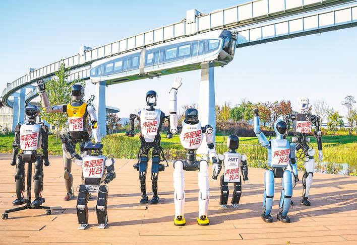 11月4日,光谷中央生态大走廊,“天问”(后排右一)等8台人形机器人齐聚一堂,为光谷马拉松助威。这8台高矮各异的机器人来自5家光谷企业和高校,都已经具备高质量运动能力。(湖北日报全媒记者 魏铼 摄)