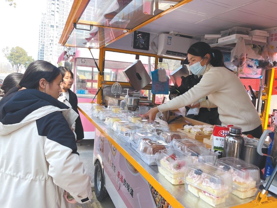 广西媳妇王宝雯的甜品车,一到放学就被学生围得满满当当。“一直喜欢做甜品,之前只敢线上接单,没勇气开实体店。”她说,去年听说社区有帮扶政策,低成本入驻还能统一办证,便第一时间报名。开起“如意甜品蛋糕”餐车后,她主打巧克力、芒果、草莓口味毛巾卷,根据学生建议调整口感,很快积累大批回头客,日均收入稳定在300元。