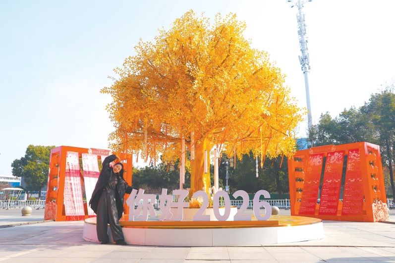 仙桃武商 MALL相关负责人介绍,此次《火马福颂》十二生肖运势主题美陈,在商场内外同步展出,展期将持续至春节期间,市民可近距离观赏打卡,在沉浸式的文化体验中感受别样新春氛围。图为市民在祈福树前打卡。(记者 周彬)