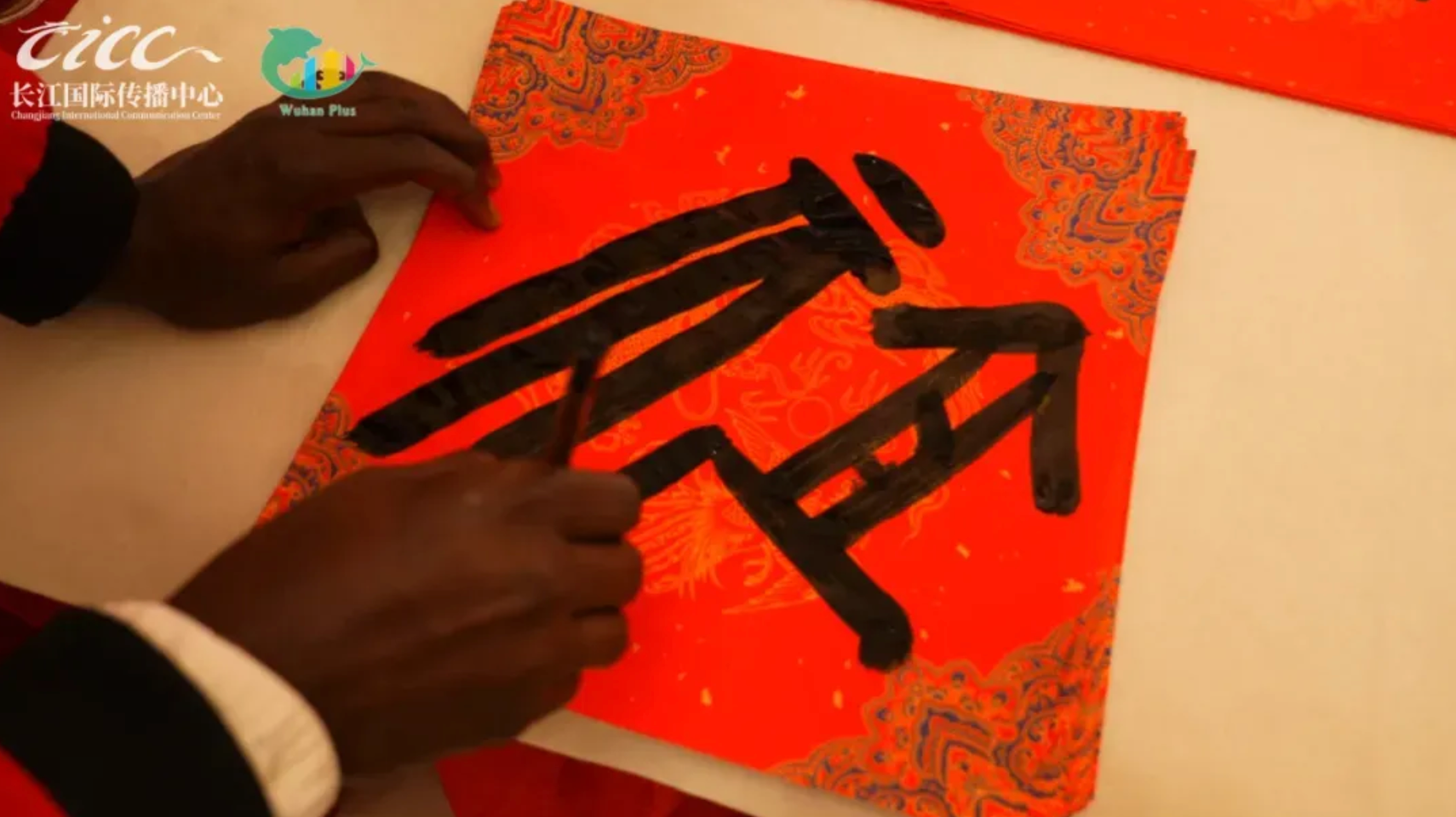 集市上,中国书法家协会会员、武汉书法家协会副主席褚群杰正凝神运笔。郭飞龙上前用略带生硬但热情的中文说:“老师您好!我想学写‘福’字!”