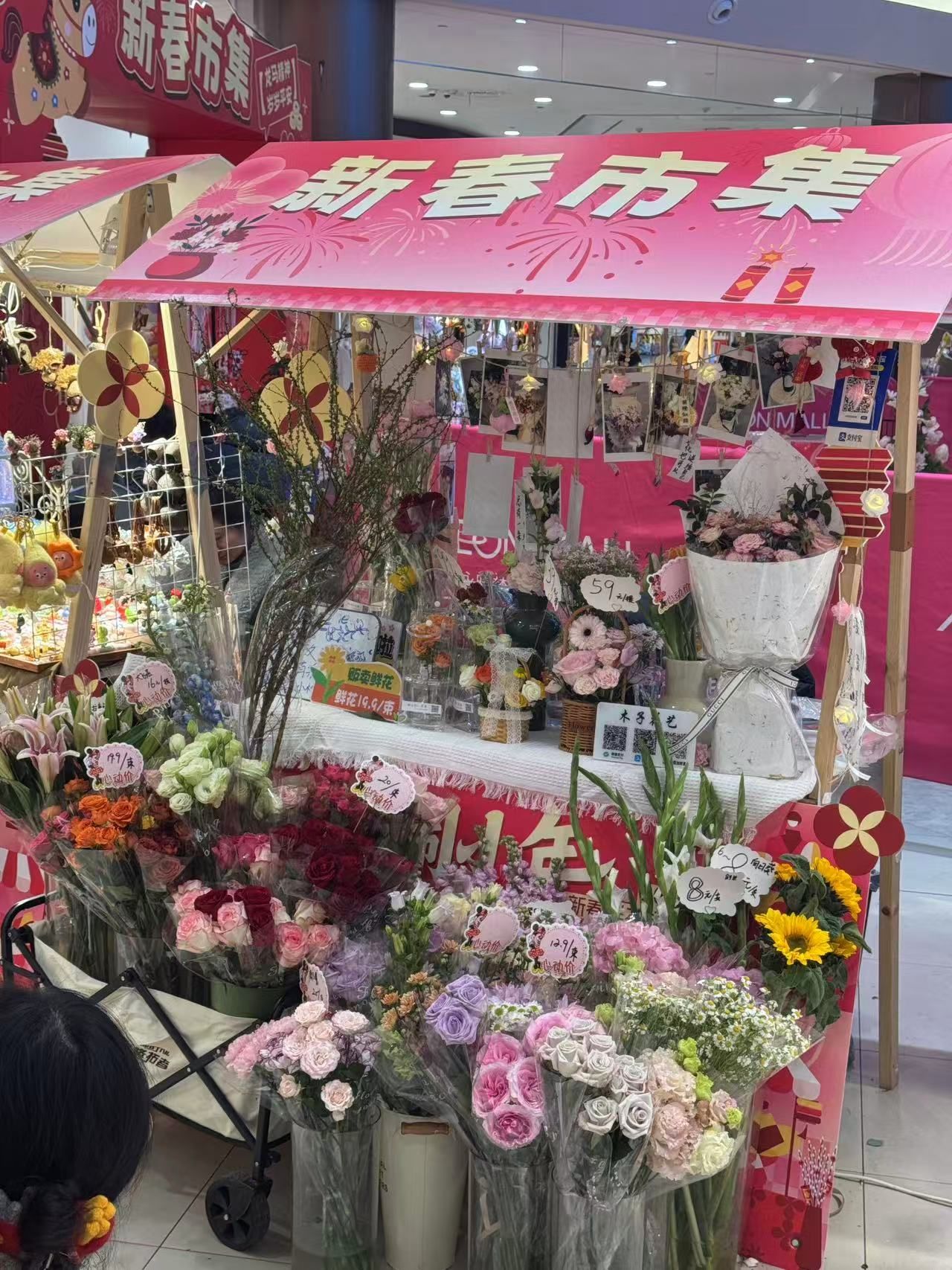 停在摊位前的张女士一眼看中了一盆富贵竹,而儿子抱着一匹背上绣着“福”字的红色小马“不肯撒手”。“我们本来是来商场买年货的,看到这里的鲜花特别有新年气氛,这些好寓意、好养活的年宵花希望能在新的一年里为小家庭带来好运!”她一边扫码付款,一边笑着说。