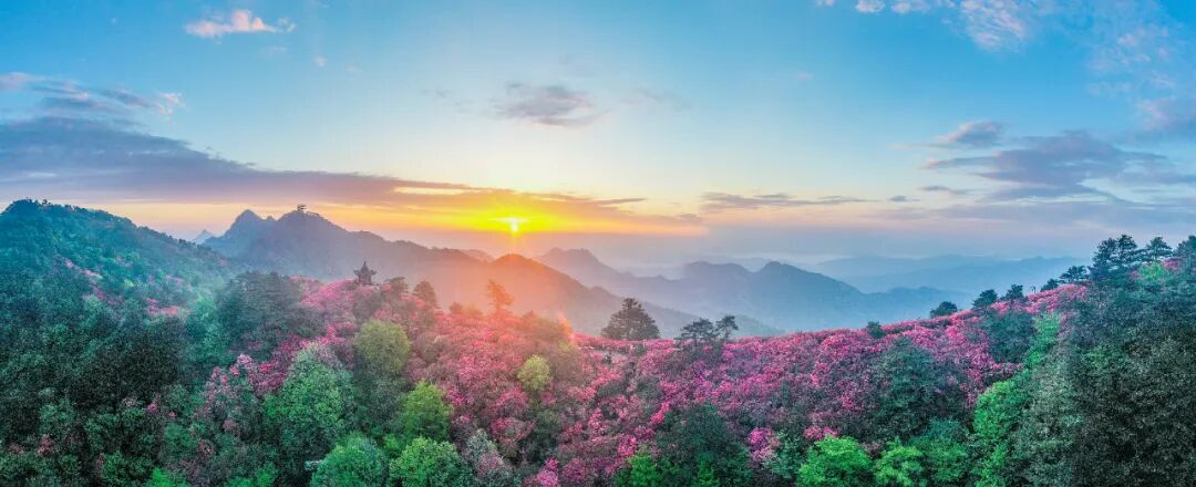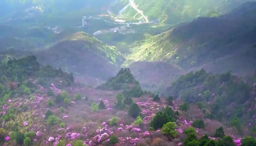 2️⃣麻城龟峰山景区:万亩紫藤花和杜鹃花交相辉映,绝无仅有的高山万紫千红画面。花开时节,满岭红遍,红中透紫,红霞漫天,紫云升腾,花香扑鼻,呈现出红紫相间的奇妙画卷,堪称一绝!