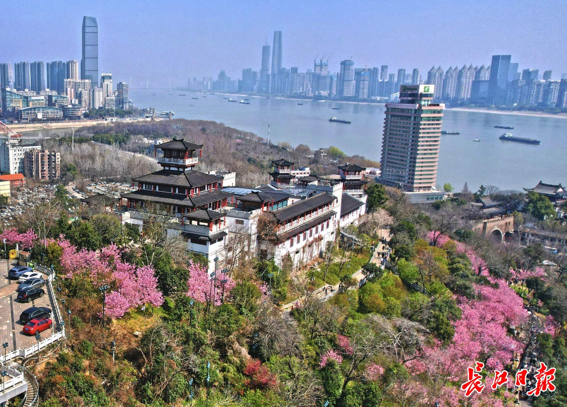 龟山樱花栈道游人摩肩接踵,樱花簇拥的知音殿与汉口、武昌高楼隔江相望。长江日报记者苗剑 摄