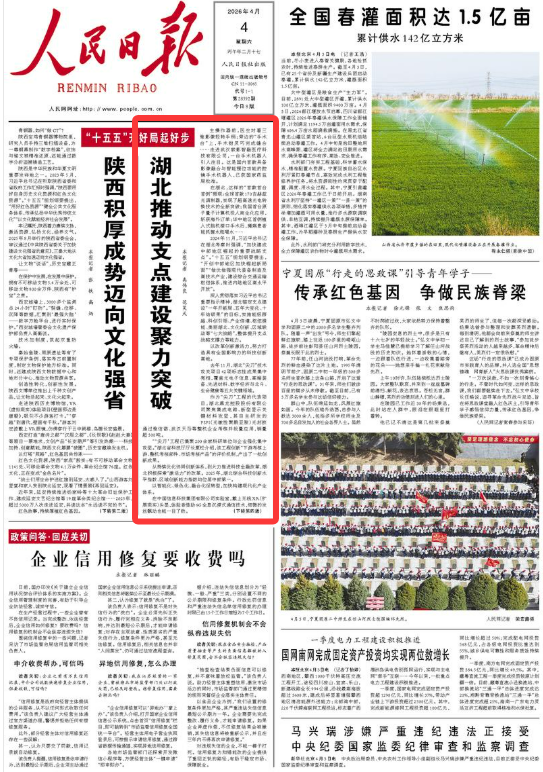4月4日,《人民日报》头版头条报道湖北,在“'十五五'开好局起好步”专栏刊发文章《湖北推动支点建设聚力突破》,聚焦湖北以改革创新激活力,努力打造具有全国影响力的科技创新高地。