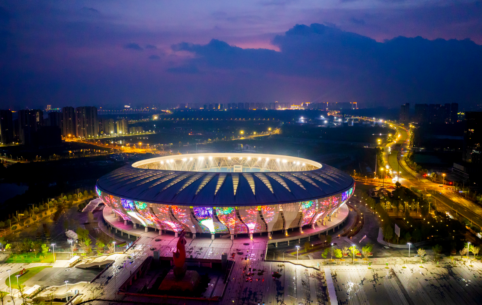 4月3日晚,黄石奥体中心体育场正在进行灯光调试。 298400盏多彩动画泛光灯同步点亮,流光溢彩,将赛场装点得璀璨夺目,体育场内灯光也在同步安装调试中。璀璨灯火蓄势以待,迎接“楚超”开幕式及揭幕战盛大启幕。石勇/摄