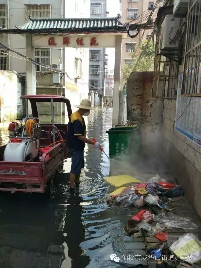自7月7日起我办各个社区干部积极参与社区灾后消毒工作,以及动员居民做好自家的消毒工作,气温渐高,灾后细菌滋生速度快,食品易腐败,请大家注意食品安全防范。 流潭社区水灾后在辖区内进行消毒 何湾社区在社区内喷洒灭蝇药物 叶王社区在社区内喷洒消毒药物