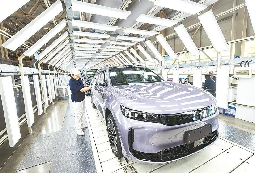 岚图汽车总装车间内,工人在流水线上作业,一辆辆新能源汽车驶下生产线。(湖北日报全媒记者 薛婷 摄)